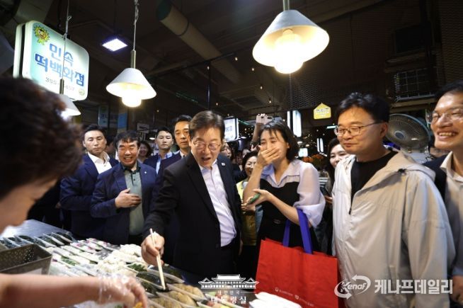 케나프데일리 이은성 기자 | 이재명 대통령 내외는 영화관람 후 서울 은평구에 위치한 연서시장을 깜짝 방문해 민생회복 소비쿠폰의 체감 효과를 묻고 상인들을 격려했다.