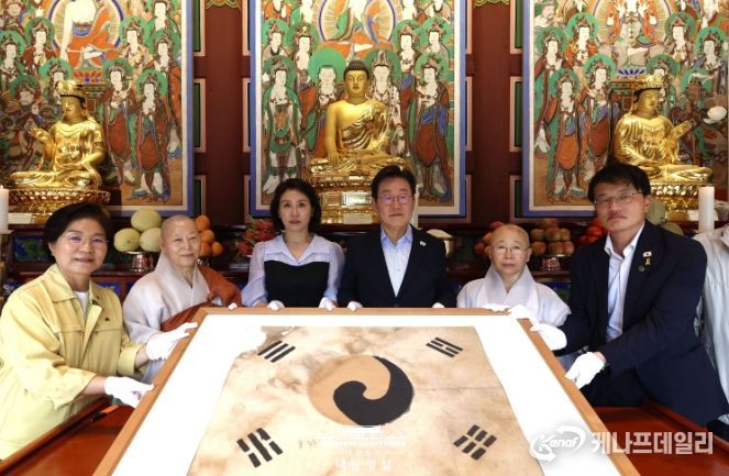 케나프데일리 이은성 기자 | 이재명 대통령 내외는 17일 오후 서울 은평구에 위치한 진관사를 방문했다. 진관사는 일제강점기 일장기 위에 먹물로 태극문양과 4괘를 덧칠해 만든 '진관사 태극기'와 독립신문이 발견된 역사적인 사찰이다.