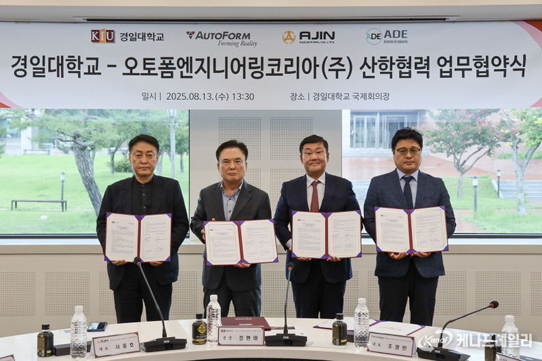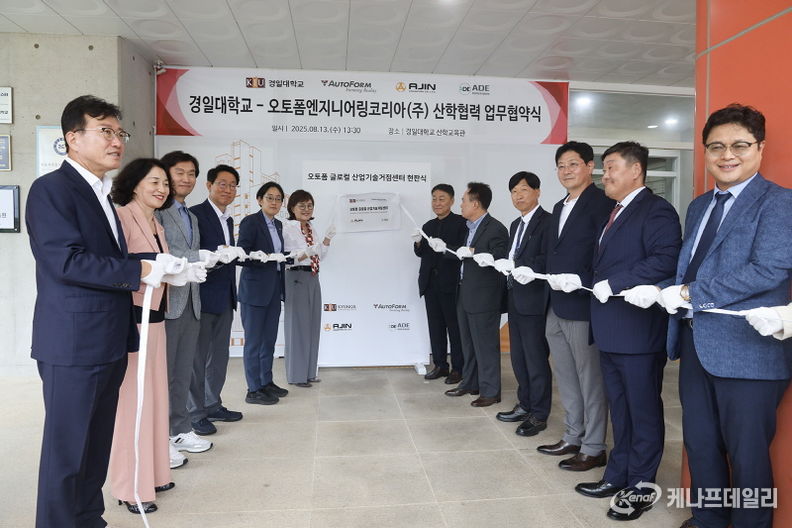 케나프데일리 이은성 기자 | 2025년 8월 13일(수), 글로벌 금형 시뮬레이션 소프트웨어 기업 오토폼엔지니어링코리아㈜는 경일대학교, 아진산업㈜과 ‘산학협력 업무협약’을 체결하고 오토폼 글로컬 산업기술거점센터를 설립했다. 이번 협약식에는 양금희 경상북도청 경제부지사, 조현일 경산시장, 국민의힘 조지연 의원, 김상훈 의원, 이철식 경산북도의원, 윤기현 경산시의원, 이윤화 경북교육청 교육국장이 참석해 지역 경제 활성화와 제조업 인재 양성에 힘써줄 것을 당부했다.