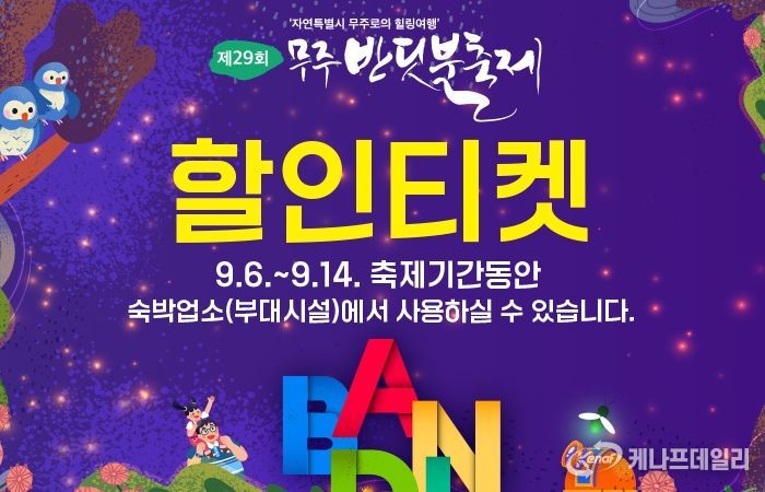 무주군에 따르면 9월 6일부터 14일까지 무주반딧북축제 누리집 ‘축제 자료마당-관광객 인센티브’ 페이지의 할인 티켓을 출력해서 제시하면 이용 업소별로 다양한 혜택을 누릴 수 있다.