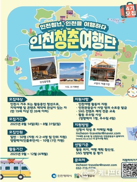 케나프데일리 이은성 기자 | 인천광역시와 인천관광공사는 인천 지역 청년들이 직접 여행을 체험하고 콘텐츠를 제작홍보하는 ‘인천청춘여행단 4기’참가자를 8월 14일부터 8월 31일까지 모집한다고 밝혔다.