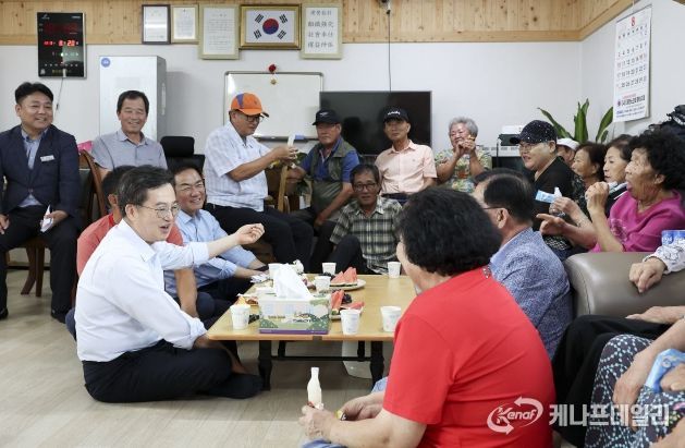 케나프데일리 이은성 기자 | 김동연 지사가 탑승한 ‘달달버스’가 TOK 평택 포승공장 착공식을 마치고 달려간 곳은 포승읍 내기1리 무더위 쉼터. 1층 거실에 어르신 30여 명이 김동연 지사를 맞이했다.