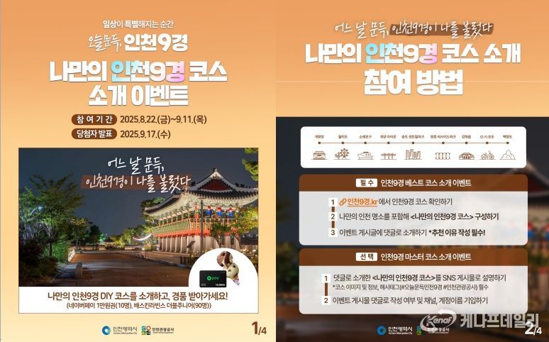 케나프데일리 이은성 기자 | 인천광역시와 인천관광공사(사장 백현)는‘2025 인천9경 통합 홍보 캠페인’의 일환으로 오는 8월 22일부터 9월 11일까지 '3차 온라인 이벤트'를 진행한다. 이번 이벤트는 시민과 관광객이 직접 자신만의 인천9경 코스를 구성하고 추천 이유를 공유하며, 온라인 참여 확산과 신규 코스 발굴을 목표로 한다.