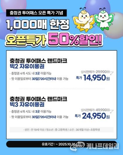 케나프데일리 이은성 기자 | 충청광역연합은 충청권 대표 관광상품 ‘충청권투어패스’의 출시를 기념해, 랜드마크 자유이용권을 기존 판매가의 절반 가격으로 제공하는 ‘오픈 특가 프로모션’을 진행한다고 밝혔다.