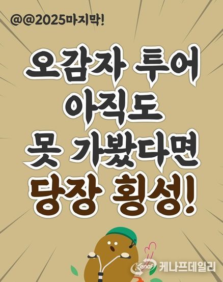 케나프데일리 이은성 기자 | 강원관광재단은‘2025-2026 강원 방문의 해’를 맞아 영서 내륙 5개 시군과 함께 다섯발자국 공동 홍보 마케팅 사업의 일환으로 5개 도시 순회의 대미를 장식하는 다섯 번째 ‘오감자 축제(페스타)’를 9월 6일부터 7일까지 횡성에서 개최한다고 밝혔다.