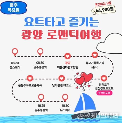 케나프데일리 이은성 기자 | 광양시가 다채로운 특별코스로 구성된 남도한바퀴 가을 테마 ‘요트 타고 즐기는 광양로맨틱여행’을 오는 9월 4일 첫 운행한다고 밝혔다.