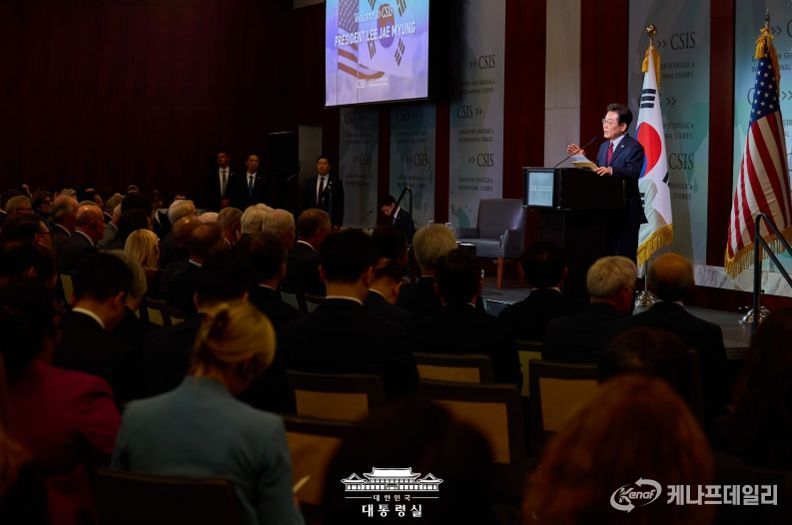 이 대통령은 이날 미국 워싱턴DC의 싱크탱크 전략국제문제연구소(CSIS)에서 한 연설에서 "저와 트럼프 대통령은 '국익중심 실용동맹'의 새 지평을 열어가고자 한다"며 이 같이 밝혔다.