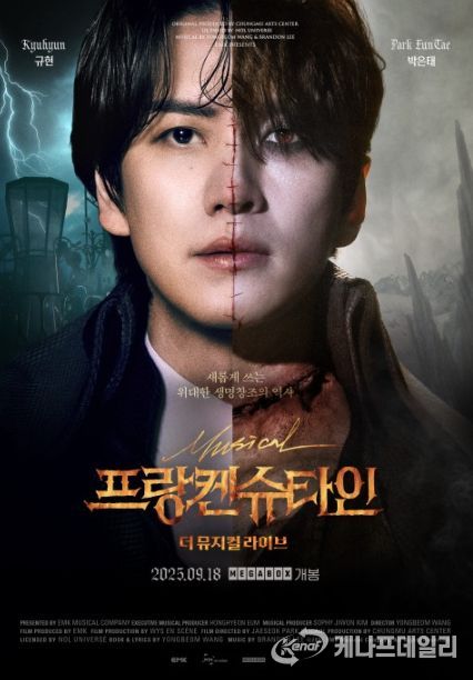 이번 포스터는 규현과 박은태의 얼굴을 절묘하게 이어 붙여 창조주 ‘빅터 프랑켄슈타인’과 피조물 ‘괴물’의 운명적 대립을 강렬하게 시각화했다.