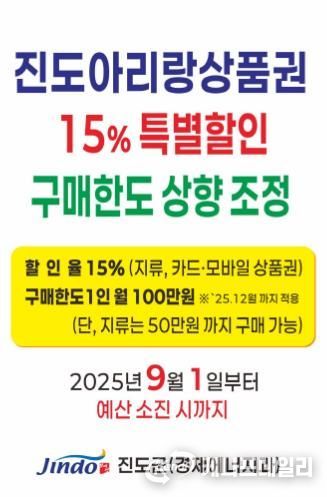 케나프데일리 이은성 기자 | 진도군은 추석 명절을 맞아 지역경제를 활성화하기 위해 9월 1일부터 진도아리랑상품권을 15% 특별 할인 판매하고, 12월까지 구매 한도를 상향 조정한다고 밝혔다.