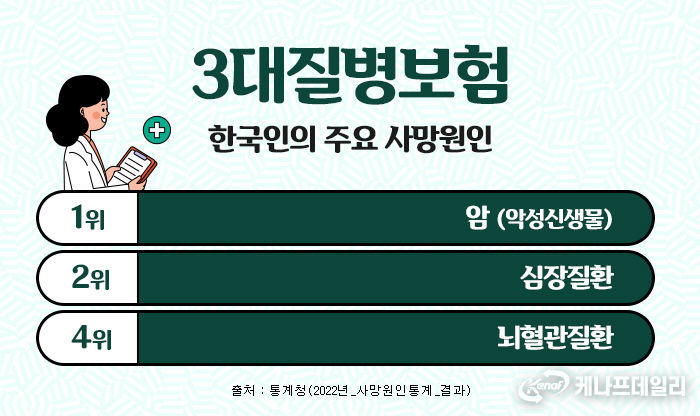 케나프데일리 이은성 기자 | 한국인의 주요 사망원인중에 암, 뇌혈관질환, 심혈관질환은 흔히 3대질병이라 일컬어지며 살아가면서 가장 먼저 대비해야 하는 중대질병으로 항상 강조되고 있다. 이들 질병에 미리 대비하기 위해 가입하는 것이 진단비보험인데, 이러한 3대질병진단비를 중점으로 보장하는 보장성보험이 3대진단비보험 이다. 3대질병진단비보험은 각각의 질병에 주목해서 보장하기도 하지만, 나에게 맞는 추가 특약을 잘 골라서 가입한다면 종합건강보험으로도 충분히 활용도가 높다.