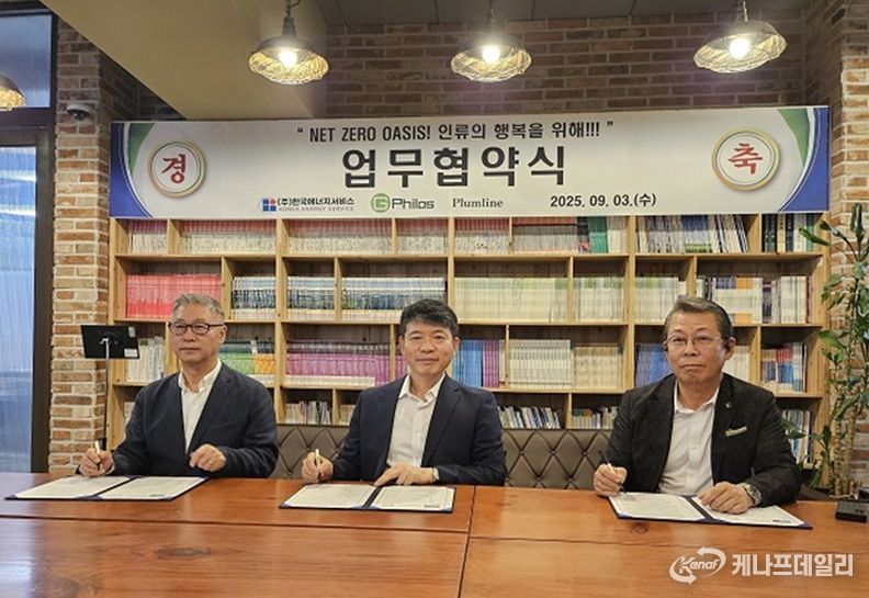 케나프데일리 이은성 기자 | 2025년 9월 4일, ㈜한국에너지서비스(대표 김영직)는 컨설팅 기업 Plumline(대표 신이철), ㈜지필로스(대표 박가우)와 함께 가칭 ‘Net Zero Oasis’ 통합 신재생에너지 플랫폼의 공동 개발과 보급을 위해 9월 3일 3자 업무협약(MOU)을 체결했다.