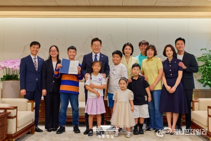 케나프데일리 이은성 기자 | 4일 오전 이재명 대통령과 김혜경 여사는 대통령에게 직접 손편지를 써서 보낸 어린이 세 명과 그 가족들을 대통령실로 초청했다.