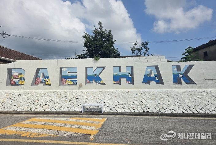 백학마을 주민들은 간척 이전 바닷물이 들어와 학이 노닐던 아름다운 마을 모습을 떠올리며 마을 경로당 앞의 노후 벽면에 ‘BAEKHAK’이라는 마을 이름을 담은 벽화 포토존을 만들었다.