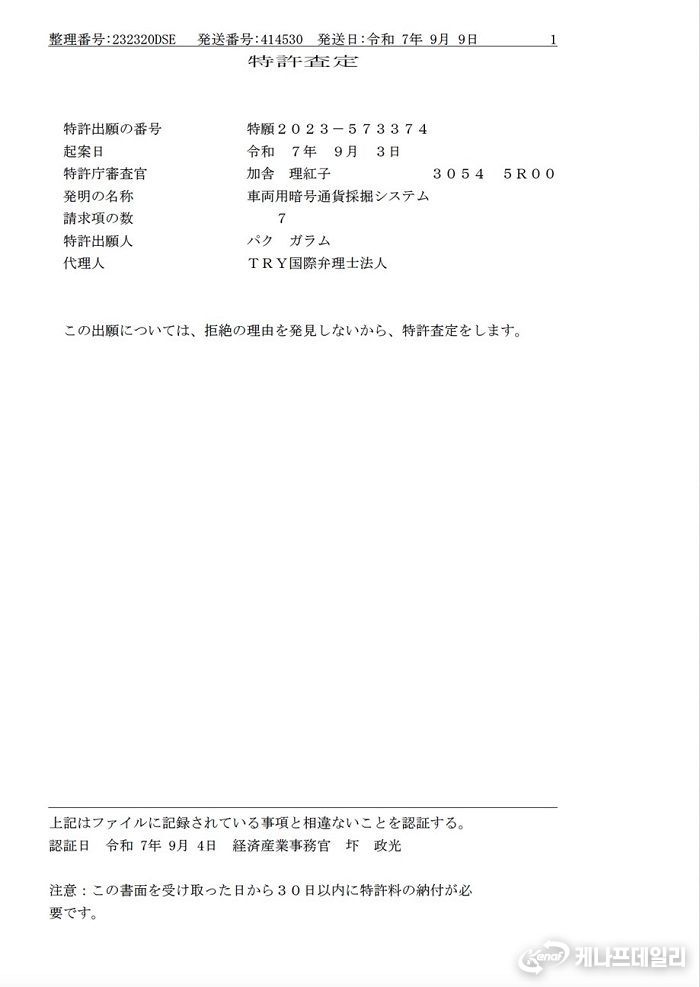 케나프데일리 이은성 기자 | 차량에서 버려지는 잉여전력을 모아 2차 배터리로 저장하고 전력소모가 많은 암호화폐채굴시스템에 적용하여 획기적인 주목을 받고 있는 (주) 브이엠에스코리아 박가람(미국명 앤디박) 대표이사가 한국, 미국, 호주에 이어 일본특허등록 결정을 받았다.