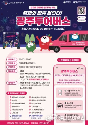 케나프데일리 이은성 기자 | 광주광역시는 ‘지(G)-페스타 광주’ 가을시즌을 맞아 광주투어버스(관광형 DRT)의 운행을 확대하고 다인패스권을 도입하는 등 관광객 편의를 높여 지역 관광 활성화를 이끈다.