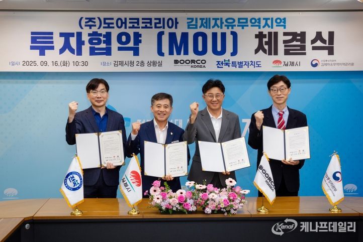16일 시에 따르면 시청 2층 상황실에서 ㈜도어코코리아와 368억 원 규모의 투자협약(MOU)을 체결했으며 이번 협약으로 김제자유무역지역에 1만 평(33,000㎡) 규모의 제2공장을 신설해 350여 명의 신규 고용이 창출될 예정이다.