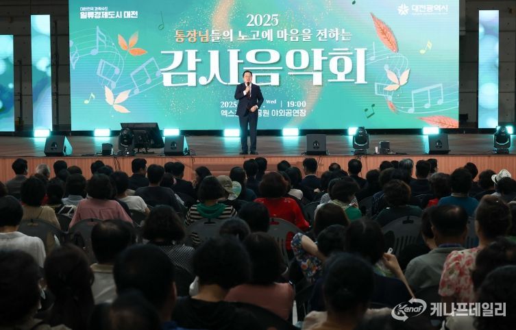 케나프데일리 이은성 기자 | 대전시는 9월 17일 오후 7시 엑스포시민광장 야외공연장에서 5개 구 2,600여 명의 통장들을 초청해 감사음악회를 개최했다. 이번 행사는 주민등록 사실조사, 복지 사각지대 발굴, 대전 0시 축제, 봉사활동 등 지역 곳곳에서 묵묵히 헌신해 온 통장들에게 감사의 마음을 전하기 위해 마련됐다.