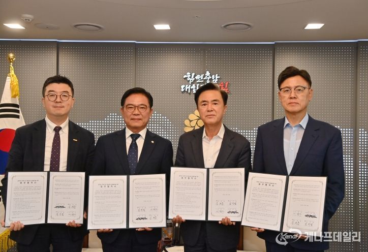 김태흠 지사는 23일 도청 접견실에서 김석필 천안시장권한대행, 이명수 오송첨단의료산업진흥재단 이사장, 황동훈 (재)원주의료기기산업진흥원 전략기획실장과 ‘치의학과 의료기기 산업 간 연계를 통한 전주기 협력체계 구축 업무협약’을 체결했다.