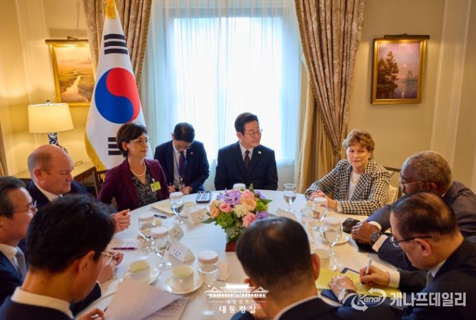 케나프데일리 이은성 기자 | 유엔총회 참석 차 미국을 방문한 이재명 대통령이 22일(현지시간) 오후 뉴욕에서 미 상원 외교위 및 하원 외무위 소속 의원 4명을 접견하고, 한미동맹 강화, 한미 경제협력 확대 및 한반도 문제 등에 대해 의견을 교환했다.