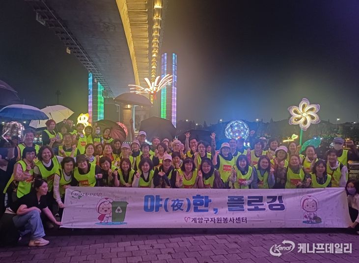 케나프데일리 이은성 기자 | 인천 계양구자원봉사센터는 지난 24일 저녁, ‘계양아라온 아트웨이(빛의 거리 3단계)’와 ‘가을꽃 국화축제’가 열리는 현장에서 자원봉사자 74명과 함께 ‘야(夜)한 플로깅’ 봉사활동을 진행했다.