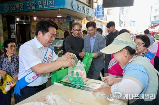 케나프데일리 이은성 기자 | 오세현 아산시장이 추석 명절을 앞둔 2일, 온양온천시장을 방문해 상인들을 격려하고 직접 장을 보며 명절 물가를 살폈다.
