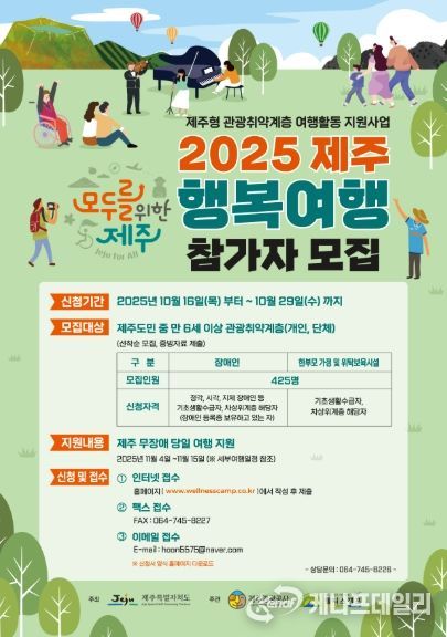 모집은 선착순으로 진행되며, 제주도민으로서 기초 생활 수급자, 차상위계층, 장애인 등 425명이 대상이다. 도내 관련 단체 또는 개인 단위로 신청이 가능하며, 팩스, 이메일을 통해 접수할 수 있다.