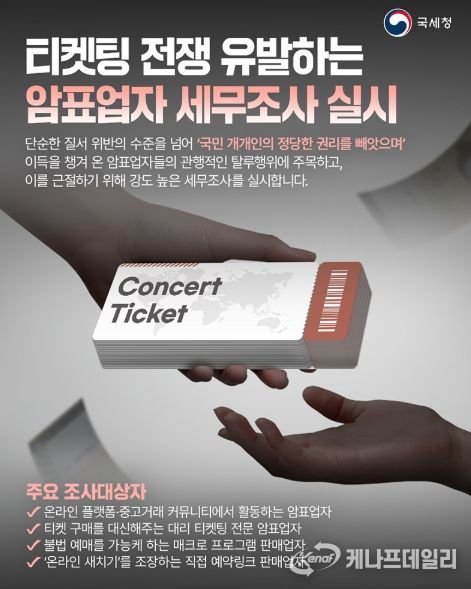 케나프데일리 이은성 기자 | 단순한 질서 위반의 수준을 넘어 '국민 개개인의 정당한 권리를 빼앗으며' 이득을 챙겨 온 암표업자들의 관행적인 탈루행위에 주목하고, 이를 근절하기 위해 강도 높은 세무조사를 실시합니다.