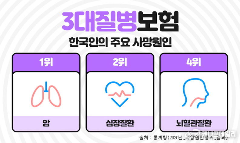 케나프데일리 이은성 기자 | 한국인의 주요 사망원인중에 암, 뇌혈관질환, 심혈관질환은 흔히 3대질병이라 일컬어지며 살아가면서 가장 먼저 대비해야 하는 중대질병으로 항상 강조되고 있다. 이들 질병에 미리 대비하기 위해 가입하는 것이 진단비보험인데, 이러한 3대질병진단비를 중점으로 보장하는 보장성보험이 3대진단비보험 이다. 3대질병진단비보험은 각각의 질병에 주목해서 보장하기도 하지만, 나에게 맞는 추가 특약을 잘 골라서 가입한다면 종합건강보험으로도 충분히 활용도가 높다.