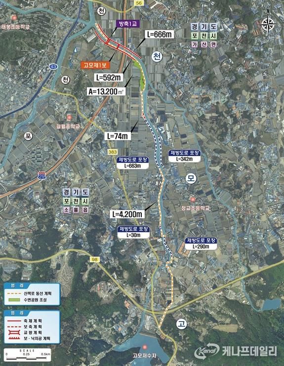 정비사업은 포천시 소흘읍 고모리에서 가산면 일원까지 총 연장 4.1km 구간을 대상으로 추진된다. 하천 제방 1.26km 보강을 통해 고모천의 홍수 대응 능력을 우선 개선하고 하천 유휴지를 활용하여 수변공원과 산책로를 조성해 주민들이 안전하게 이용할 수 있도록 하는 사업이다.