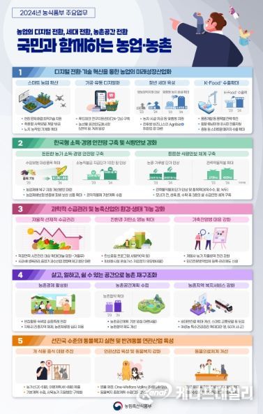 케나프데일리 관리자 기자 | 농림축산식품부는 농업의 디지털전환·세대전환·농촌공간 전환 등 3대 전환을 바탕으로 국민 모두에게 열린 기회가 되는 농업·농촌을 만들기 위한 2024년 주요 업무계획을 발표했다.