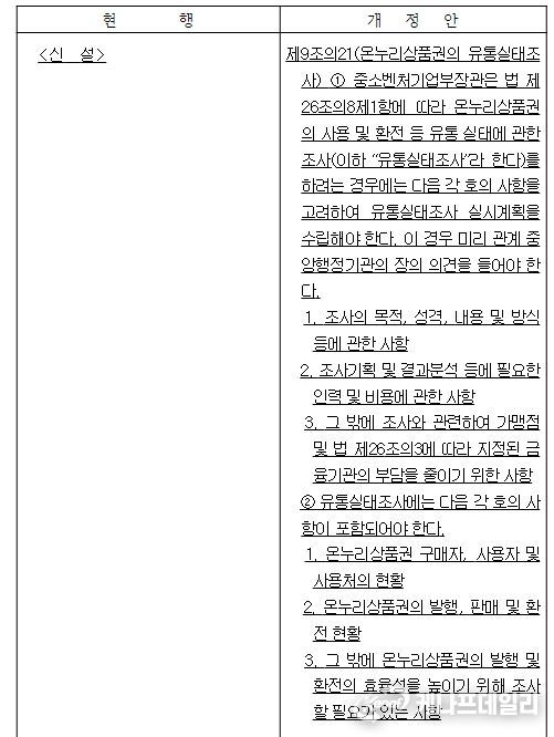 이번 시행령 개정은 온누리상품권 유통 실태조사 근거 및 자료 요청 권한 등을 규정하는 「전통시장 및 상점가 육성을 위한 특별법」이 작년 9월 14일에 개정됨에 따라 시행령에 위임된 필요 사항을 정하는 후속 조치이며, 이번 국무회의 의결을 거쳐 공포일로부터 6개월 후인 올해 3월 15일에 시행된다.