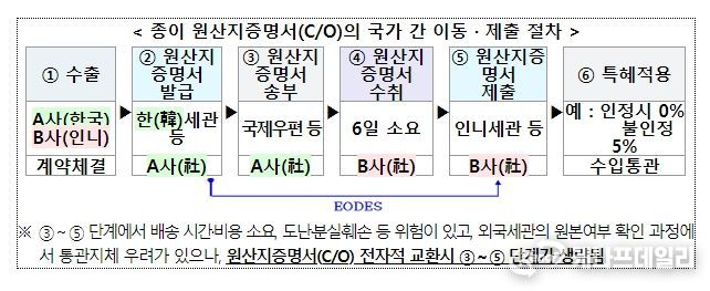 동 시스템을 통해 원산지정보가 전자적으로 실시간 교환되면, 우리 수출기업은 인니 관세당국에 ‘종이’ 원산지증명서를 제출하지 않아도 한-인니 포괄적 경제동반자 협정(CEPA) 특혜관세를 적용받을 수 있다.