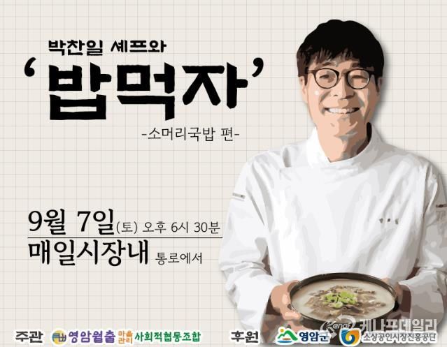 케나프데일리 이은성 기자 | 영암군이 7일 오후 6시 30분부터 영암읍 매일시장 거리에서 대표 먹거리 개발 요리 콘서트 ‘박찬일 셰프와 밥먹자’를 개최한다.