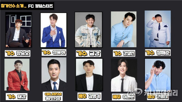 남자팀 FC 킹덤스타즈는 ‘정통트롯 황태자’로 불리는 정다한이 주장을 맡아 팀을 이끌며, 재강,양승호, 정해준, 이수호, 김선준, 금강, 김동찬, 성용하, 강설민, 김영기, 권용태, 이윤신,황인성 등 개성 넘치는 멤버들이 함께한다. 풋살 경기를 통해 그들의 새로운 면모를 팬들에게 선보일 예정이다.