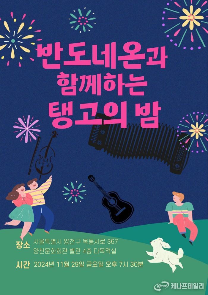 케나프데일리 이은성 기자 | 깊어가는 가을밤, 매혹적인 탱고 선율로 물들일 특별한 공연이 찾아온다. 반도네오니스트 최예슬은 오는 11월 29일 양천문화회관 별관 4층 다목적실에서 '반도네온과 함께하는 탱고의 밤' 공연을 개최한다.