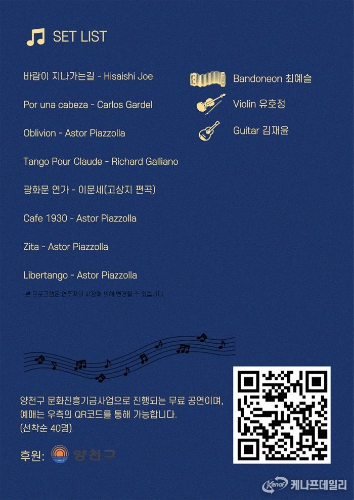 이번 공연은 양천구 문화진흥기금사업의 일환으로 기획됐으며, 최예슬이 직접 기획하여 바이올린, 클래식 기타와 함께 탱고 음악의 진수를 선보일 예정이다.