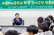 케나프데일리 이은성 기자 | 진교훈 서울 강서구청장이 8일 구청 대회의실에서 마곡하늬중학교 3학년 학생들과 직접 대화하며 소통하는 시간을 가졌다. 구는 행정이 어떻게 이뤄지고, 공무원이 어떤 역할을 하는지 학생들이 현장에서 직접 체험하며 이해할 수 있도록 이날 자리를 마련했다. 3학년 1반과 4반 학생 40여 명이 구청을 찾아 진 구청장과 만났다. 진 구청장은 “구청에 직접 와보니깐 어때요?”라고 질문을 하며 대화를 이끌어갔다. 학생들의 장난스러운 질문에도 유쾌하게 답변했고 대화 내내 웃음이 끊이지 않았다. 길거리 흡연 등 생활불편부터 강서구의 주요 정책과 예산 규모, 10년 후 강서구에 필요한 정책에 이르기까지 폭넓게 대화했다. 진 구청장은 “마곡지구 발전과 맞물려 유동인구가 많아짐에 따라 간접흡연 피해 민원도 늘고 있다”며 “흡연 단속과 계도를 병행해 피해를 줄여나가겠다”고 말했다. 마곡 통합신청사와 신경제축 조성 등 굵직한 사업에 대해서는 학생들의 눈높이에 맞춰 알기 쉽게 설명했다. 10년 후 정책에 대해선 “변화의 속도가 매우 빠르기 때문에 기술의 발달