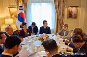 케나프데일리 이은성 기자 | 유엔총회 참석을 계기로 방미 중인 이재명 대통령이 22일(현지시간) 첫 번째 일정으로 세계경제포럼(WEF) 의장인 블랙록의 래리 핑크 회장, GIP의 아데바요 오군레시 회장, 김용 전 세계은행 총재와 만났다. 이번 만남에선 인공지능과 에너지 전환, 인구 변화라는 인류의 세 가지 대전환 과제를 중심으로 논의가 이뤄졌으며, 동시에 한국과 글로벌 투자사 간 전략적 협력을 위한 공감대를 확인했다. 래리 핑크 회장은 AI와 탈탄소 전환은 반드시 함께 진행되는 것이 중요하고, 이는 전 세계가 함께 가야 할 문제라고 강조하면서 한국이 "아시아의 AI 수도(AI Capital in Asia)"가 될 수 있도록 글로벌 자본을 연계하여 적극 협력하겠다는 의지를 밝혔다. 이재명 대통령은 한국의 아시아태평양 AI 수도 실현을 위해 협력할 수 있게 되어 환영하며, 긴밀하고 지속적인 논의를 통해 이번 협력 관계를 실질적인 협력 성과로 이어지게끔 하자고 강조했다. 또한 래리 핑크 회장을 직접 한국에 초대하기도 했다. 래리 핑크 회장 일행은 이재명 대통령의 리더십으로 취임 이후에 대한민국 증시