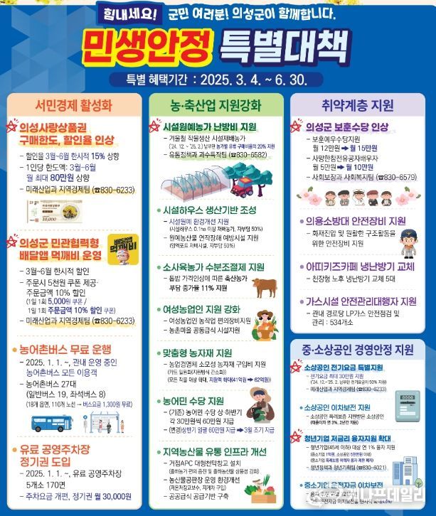 케나프데일리 이은성 기자 | 의성군은 고물가와 경기 침체로 어려움을 겪고 있는 군민들의 일상 생활 안정과 민생경제 회복을 위한 특별대책을 발표하고‘민생안정 행복 프로젝트’를 본격 추진한다.
