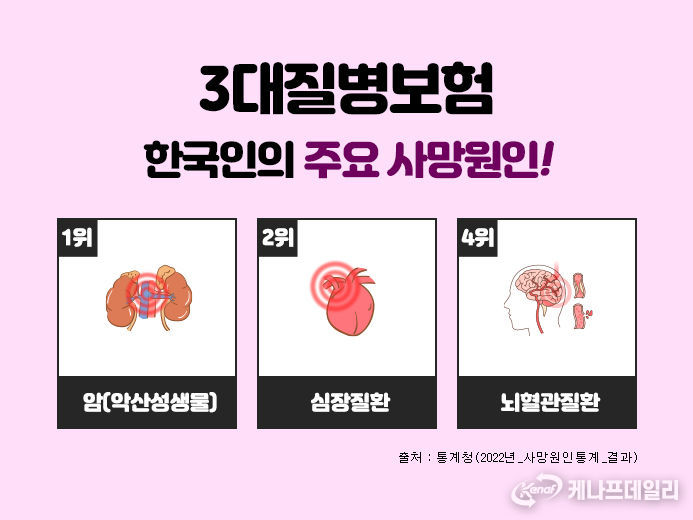 케나프데일리 이은성 기자 | 3대질병으로 일컬어지는 암, 뇌혈관질환, 심혈관질환은 한국인의 주요 사망원인에서 상위를 차지하고 있으며, 이에 대한 진단비를 집중적으로 보장해 주는 보험상품을 3대질병진단비 보험이라 할 수 있다.