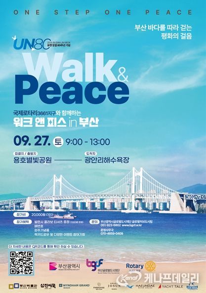 케나프데일리 이은성 기자 | 부산글로벌도시재단(전용우)은 9월 27일 09시부터 용호별빛공원에서 '국제로타리 3661지구와 함께하는 워크 앤 피스 in 부산'행사를 개최한다고 밝혔다.