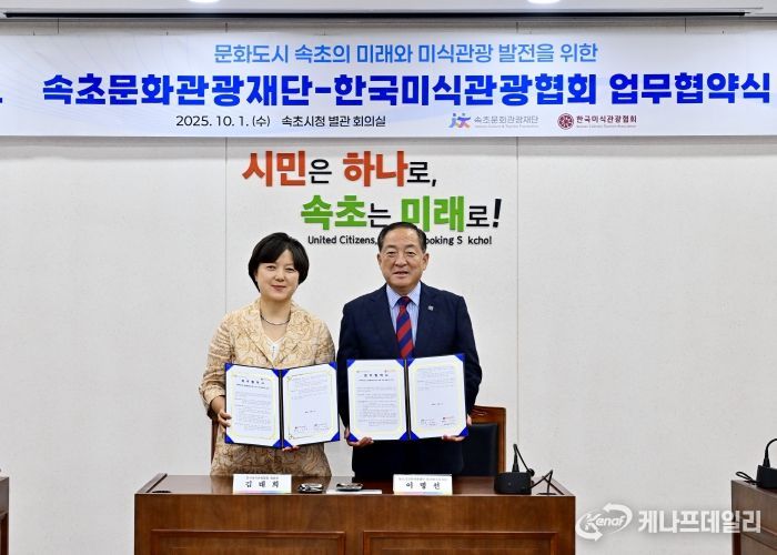 재단법인 속초문화관광재단(이사장 이병선, 속초시장)은 지난 10월 1일 사단법인 한국미식관광협회와 ‘지속 가능한 미식도시 조성을 위한 업무협약’을 체결했다. 이번 협약을 통해 속초는 음식문화와 관광 자원을 연계한 미식 콘텐츠 발굴에 본격적으로 나서며, 문화도시 도전에 속도를 낼 계획이다.