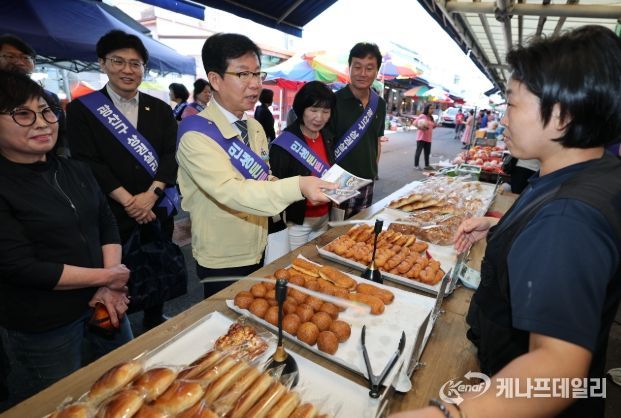 케나프데일리 이은성 기자 | 박병규 광산구청장과 광산구 공직자들이 1일 송정매일시장에서 추석 맞이 명절 장보기 행사를 진행했다.