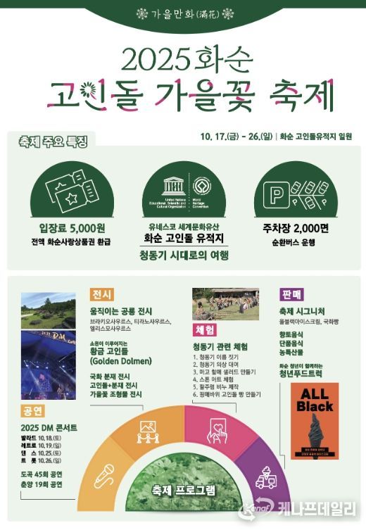 케나프데일리 이은성 기자 | 전남 화순군)이 오는 10월 17일 ~ 10월 26일까지 10일간 유네스코 세계문화유산인 화순 고인돌 유적지 일대(춘양면 대신리, 도곡면 효산리)에서 '가을만화(滿花)'를 주제로 '2025 화순 고인돌 가을꽃 축제'를 개최한다.