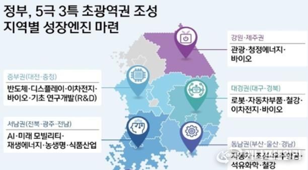 이재명 정부는 지역균형발전 정책의 큰 틀로 ‘5극 3특 체계’를 제시하며, 디지털, 에너지, 국방, 농생명, 항공우주 등 지역 특화 전략산업을 중심으로 거점별 기능 분산을 추진 중이다.