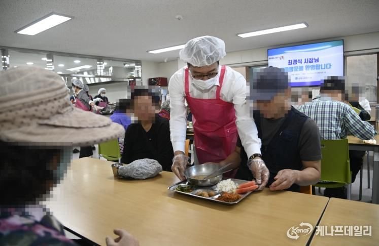 케나프데일리 이은성 기자 | 최경식 남원시장이 지난 10일 기능보강이 완료된 남원사회복지관 경로식당을 방문해 배식 봉사를 진행하며 어르신들과 소통하는 시간을 보냈다.