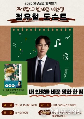 케나프데일리 이은성 기자 | 의성군은 오는 10월 16일 의성군립도서관에서 정우철 도슨트를 초청해 '내 인생을 바꾼 명화 한 점'을 주제로 저자강연을 개최한다고 밝혔다.