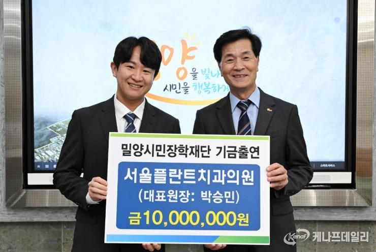 케나프데일리 이은성 기자 | (재)밀양시민장학재단은 13일 밀양시장실에서 서울플란트치과의원으로부터 장학기금 1,000만원을 기탁받았다고 밝혔다.