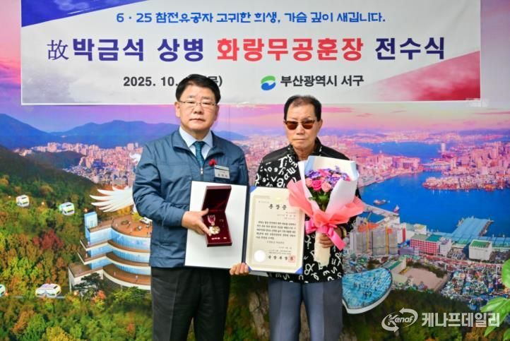 케나프데일리 이은성 기자 | 부산광역시 서구는 지난 16일, 6·25전쟁에 참전해 공을 세운 故박금석 님의 조카 박정진 씨에게 화랑무공훈장을 전수했다.