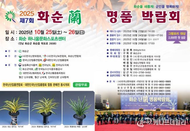 케나프데일리 이은성 기자 | 대한민국 난(蘭) 산업의 중심지로 자리매김하고 있는 전남 화순군이 ‘제7회 2025 화순 난 명품 박람회’를 오는 10월 25일부터 26일까지 이틀간 화순 하니움문화스포츠센터 실내체육관에서 개최한다.